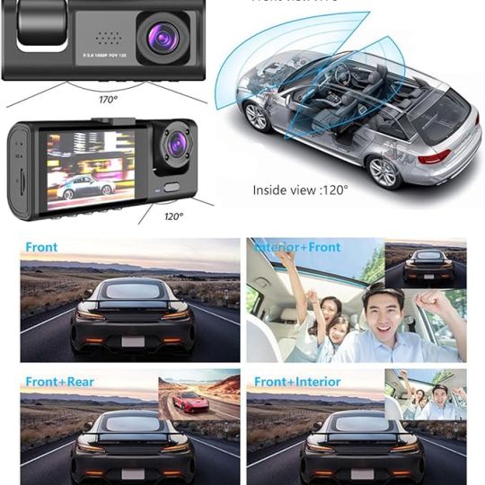 Capture every moment on the road with the 3-Camera Dash Cam, designed for comprehensive vehicle monitoring and safety. Equipped with front, inside, and rear cameras, this dual dash cam records high-definition 1080P video simultaneously to cover the road ahead, inside passenger cabin, and rear traffic, ensuring complete protection for drivers, passengers, and vehicles.